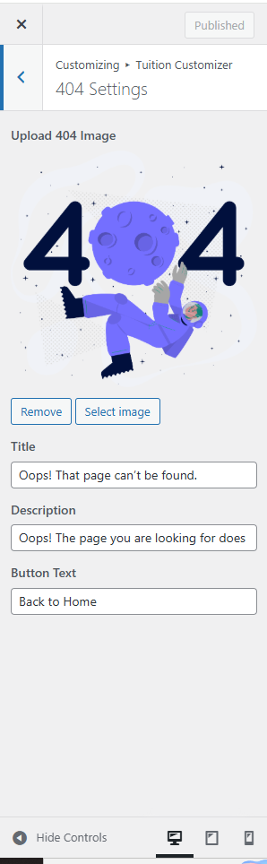 Customise → Tuition Customizer → Theme 404 Settings
