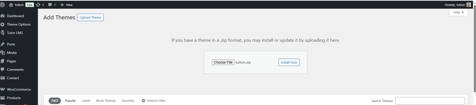 Note: When uploading your theme with the installer, please ensure you are uploading the theme .zip file, not the entire package you downloaded. In this case, you will be uploading Tuition.zip.