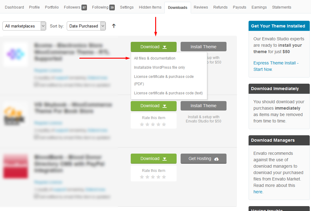 When you purchase our theme from Themeforest, you need to download the Tuition files from your Themeforest account. Navigate to your downloads tab on Themeforest and find Tuition. Click the download button to see the two options. The Main Files contain everything, the Installable WordPress Theme is just the installable WordPress theme file. Below is a full list of everything that is included when you download the main files, along with a brief description of each item.