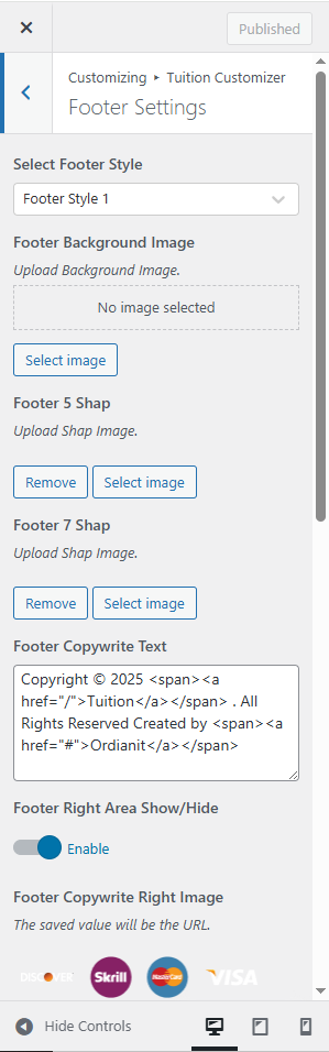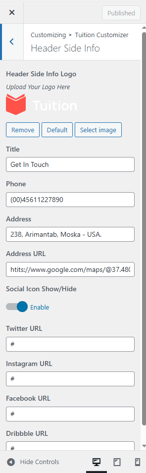 Customise → Tuition Customizer → Theme Sideinfo Settings