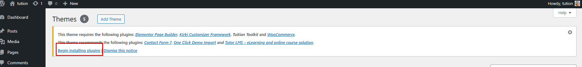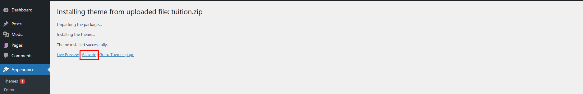 Once uploaded, activate the theme by heading to the “Themes” menu in the WordPress Dashboard. Locate the Tuitiontheme and hit “Activate”.