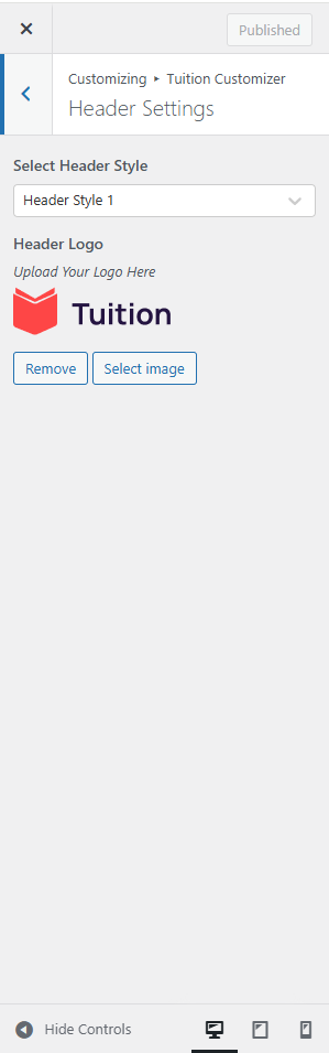 Customise → Tuition Customizer → Header