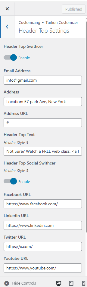 Customise → Tuition Customizer → Theme Header Top Info Setting